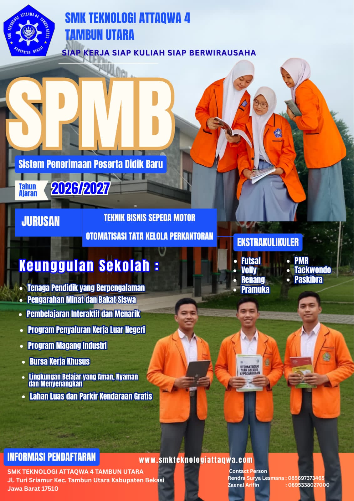 SMK TEKNOLOGI AT-TAQWA 4 membuka Penerimaan Peserta Didik Baru (PPDB) Tahun Ajaran 2026/2027 bagi lulusan SMP/MTs atau sederajat.